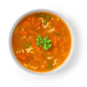 Diced carrots, potatoes, sweet corn, peas, tender macaroni, and green beans in a savory tomato-beef stock.