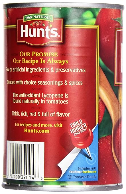 Made from all-natural, vine-ripened tomatoes simmered with salt, spices, and natural flavors for seasoning, Hunt’s Tomato Sauce contains no added sugar, corn syrup, or other sweeteners.
